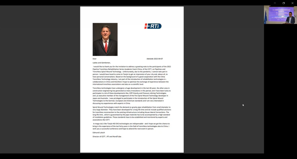 CETT欧方主任-奥地利RTi集团董事长埃德蒙先生在致辞中写道,感谢众多行业内的企业家和学者参加本次会议,他亲身经历了过去40年中国际非开挖技术的快速发展和创新,希望CETT中心发挥纽带作用,积极组织中外交流和标准化工作,并希望以后有机会能将更加先进的非开挖技术和经验带到中国,期待参加未来的线下学术活动。