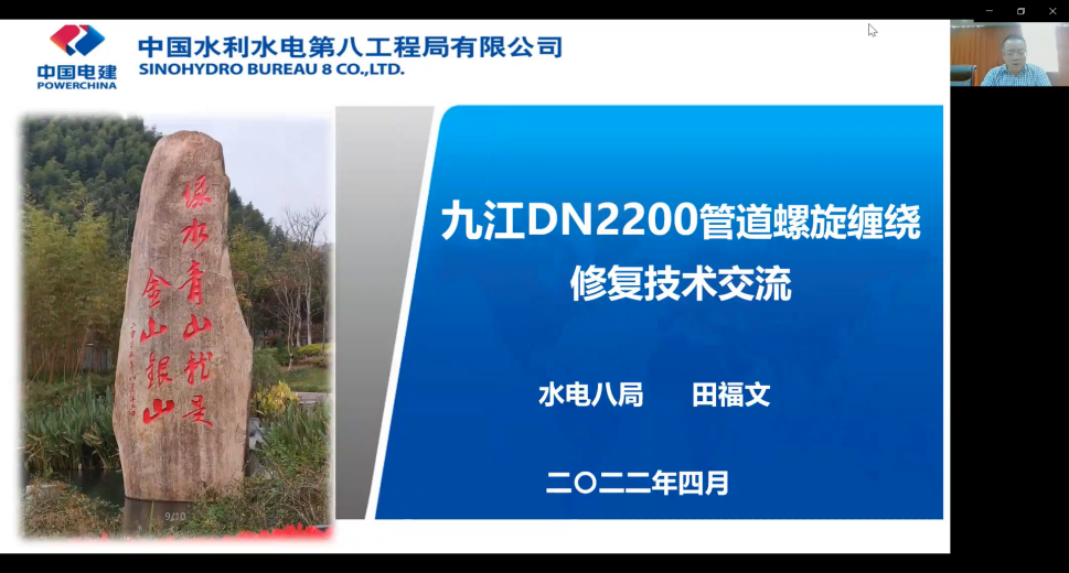 中国水利水电第八工程局有限公司田福文副总工程师报告题目是《九江DN2200管道螺旋缠绕修复技术交流》,田总对该项目工程进行了详细介绍,包括施工导排、清淤与缺陷处理、螺旋缠绕修复和施工技术总结等,为大家全面剖析了螺旋缠绕工程的关键问题。