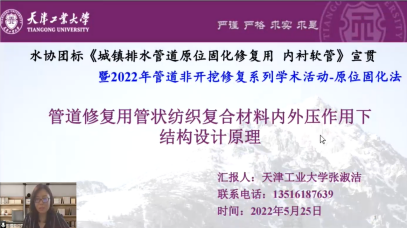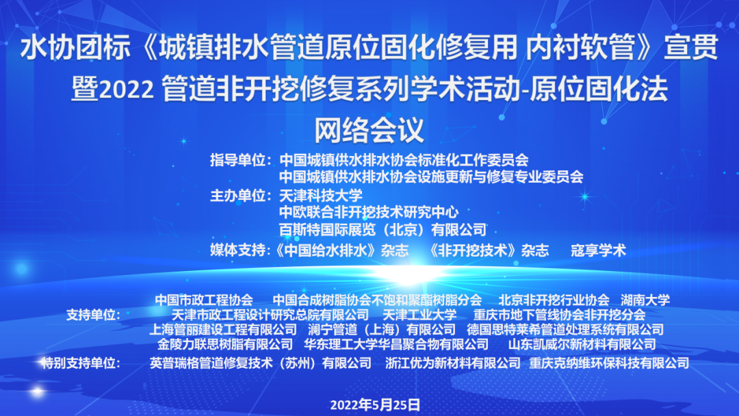 2022年5月25日,由天津科技大学组织召开了中国水协团体标准《城镇排水管道原位固化修复用 内衬软管》(以下简称《内衬软管》)宣贯暨2022管道非开挖修复系列学术活动—原位固化法(CIPP)学术交流会议,因疫情原因,会议以网络的方式召开。