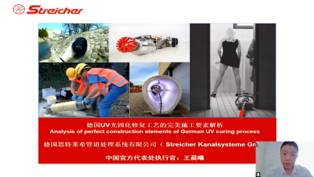 德国斯特莱希管道处理系统有限公司中国官方代表处执行官王晨曦先生,从材料、预处理、有毒有害气体的检测,以及光固化施工等方面,对德国UV光固化修复工艺的施工要素进行了介绍,并强调了工程中的材料以及施工规范要求的重要性。