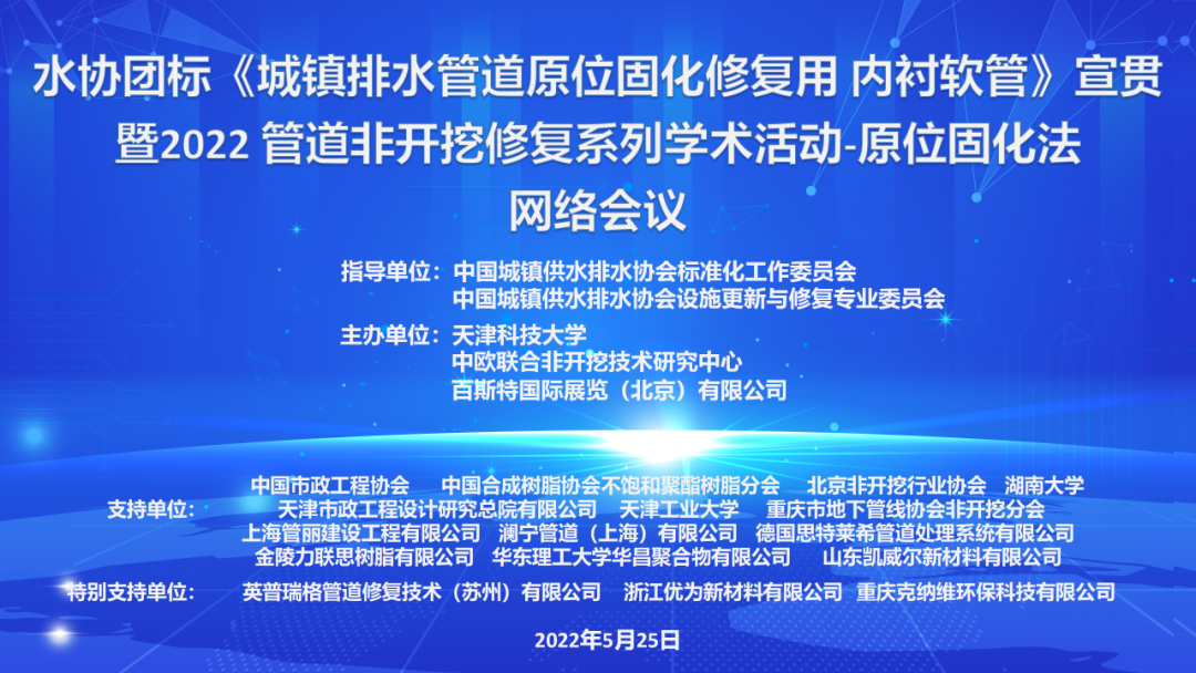 中国城镇供水排水协会团体标准《城镇排水管道原位固化修复用内衬软管》(T/CUWA 60052-2021)已经发布,并已于 2022 年 3 月份实施。为加大标准推广和实施力度,帮助用户更准确理解和使用,提高我国内衬软管的总体质量,同时,对国内外 CIPP 修复技术进行总结和研讨,促进 CIPP 非开挖修复技术高质量发展,中欧联合非开挖技术研究中心计划组织召开《城镇排水管道原位固化修复用内衬软管》宣贯会议暨 CIPP 非开挖修复技术学术会议。