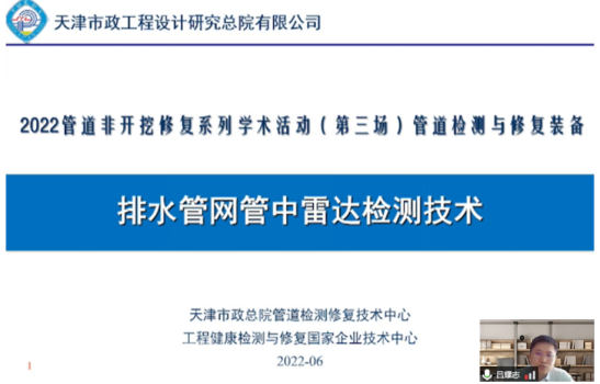 天津市政工程设计研究总院有限公司管道检测与修复技术中心吕耀志主任,就排水管网管中雷达检测技术展开介绍,展示了管中雷达检测技术的设备和施工工艺流程,对中国市政协会《管中雷达法检测排水管道技术规程》团体标准进行了介绍,并对国内外管网检测技术的发展进行了展望。