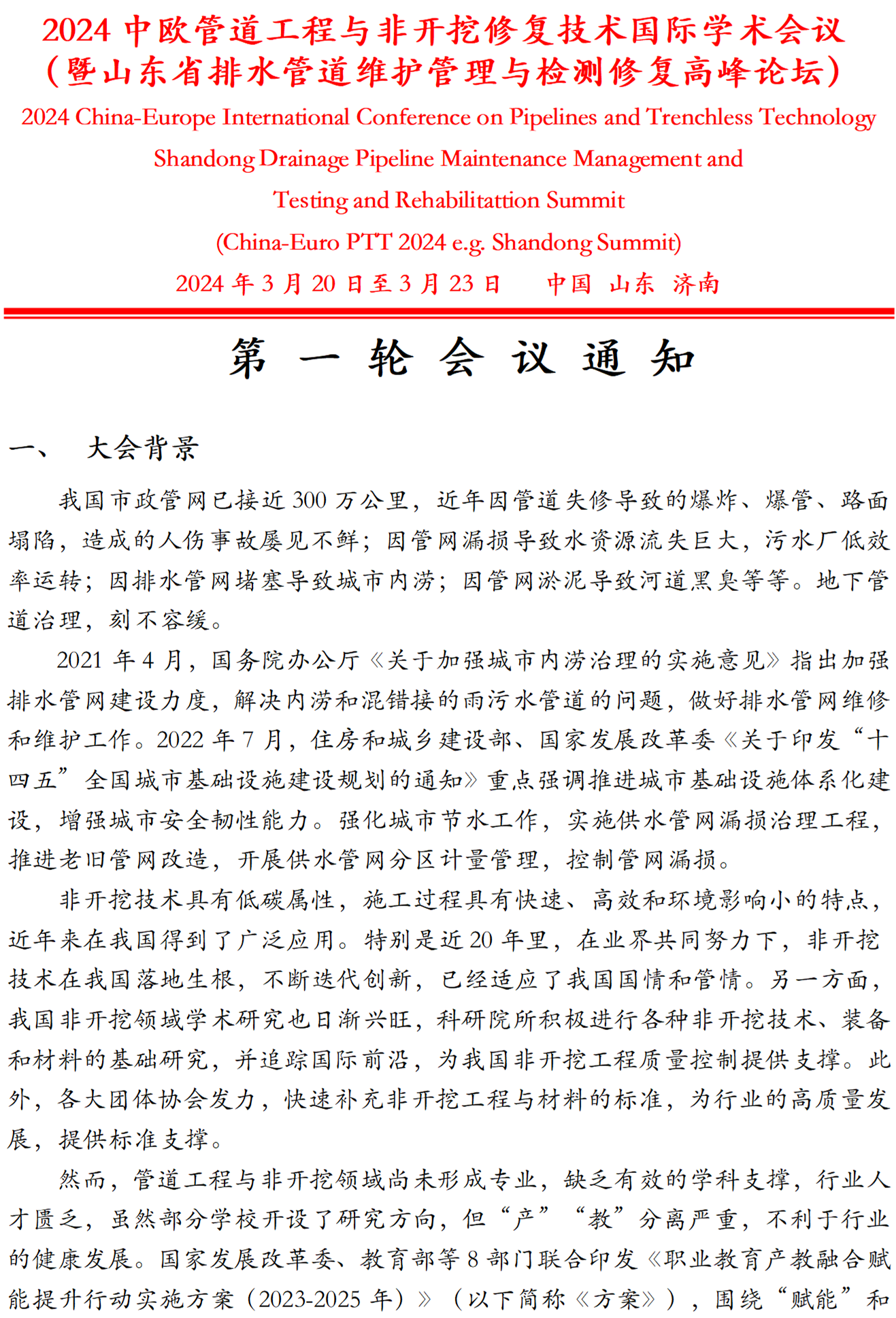 2024中欧管道工程与非开挖修复技术国际学术会议(暨山东省排水管道维护管理与检测修复高峰论坛)