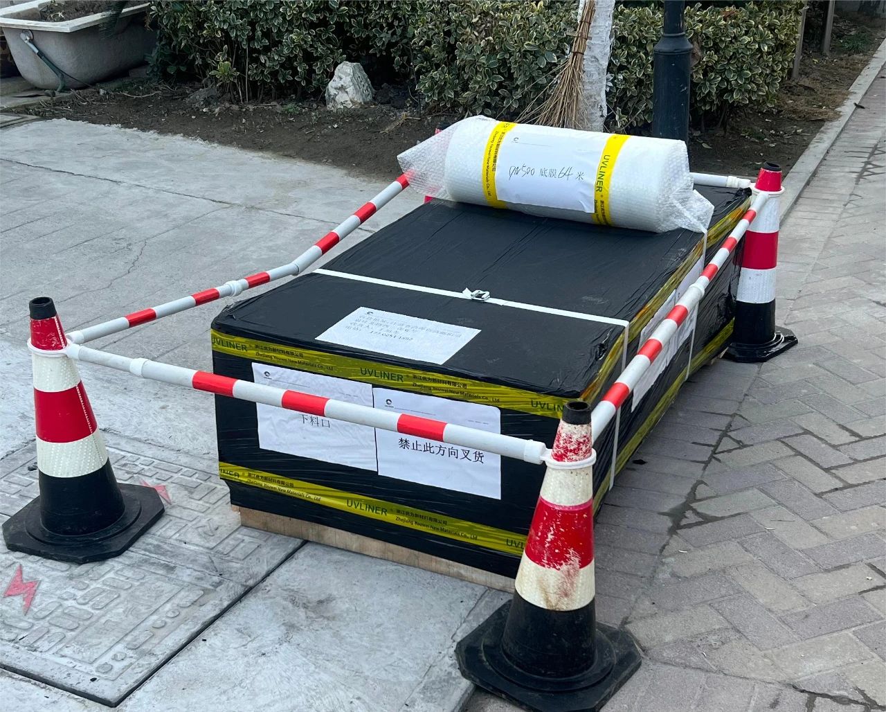 2.内衬软管存放在施工现场或室外时,则必须严格遵守附带文件中规定的温度范围存放。材料木箱必须防止阳光直射、受潮和损坏;不得将材料木箱储存于地面低洼处,并且需要将木箱整体进行垫高,高度为 15 公分,使用防水雨布进行保护(如室外空气较潮湿情况下,可在木箱上放置木板,隔开材料与防水雨布,保持通风,避免防水雨布将潮湿空气包裹住导致材料泡水)。