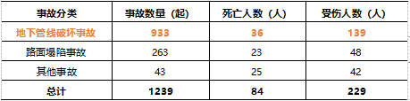 据专委会2020年度报告得知,【中规协地下管线委 | 2020年全国地下管线事故统计分析报告(戳链接回顾)】2020年1月至12月,共收集到地下管线相关事故1239起。其中,地下管线破坏事故933起,占地下管线相关事故总数的75.30%;路面塌陷事故263起,占地下管线相关事故总数的21.23%;其他类型事故43起,占地下管线相关事故总数的3.47%。事故共造成84人死亡,229人受伤。