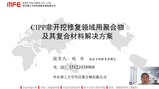 华东理工大学华昌聚合物有限公司研发中心经理刘华博士,分享了有关CIPP非开挖修复领域用聚合物及其复合材料,展示了功能树脂材料、环氧乙烯基酯树脂、华昌/防腐蚀涂料、离子交换与吸附树脂、聚砜、聚醚砜特种工程塑料的研究与应用。并提出了材料应用过程中问题的解决方案。