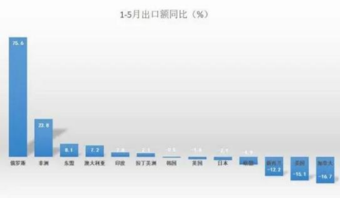 在一片下降中,对俄罗斯出口却大幅增加。数据显示,我国对俄罗斯出口增长75.6%。2023年1-5月,中俄贸易额为938.06亿美元,同比增长40.7%。其中,对俄出口429.47亿美元,增长75.6%;自俄进口508.59亿美元,增长20.4%。