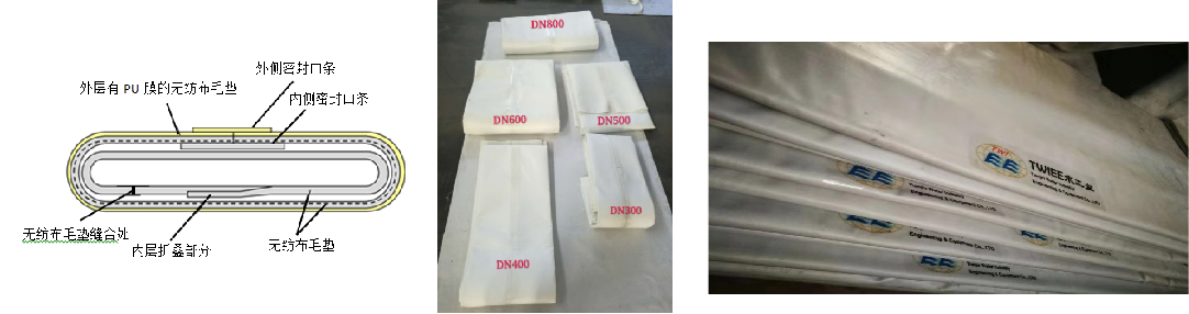 TWIEE系列无纺布内衬软管:管径DN300-DN2500,基材由短针刺无纺布和防渗层(TPU膜)构成,无纺布规格:600g/m2(3mm)、800g/m2(4mm)、1000g/m2(5mm),TPU膜规格:0.5mm和0.6mm。